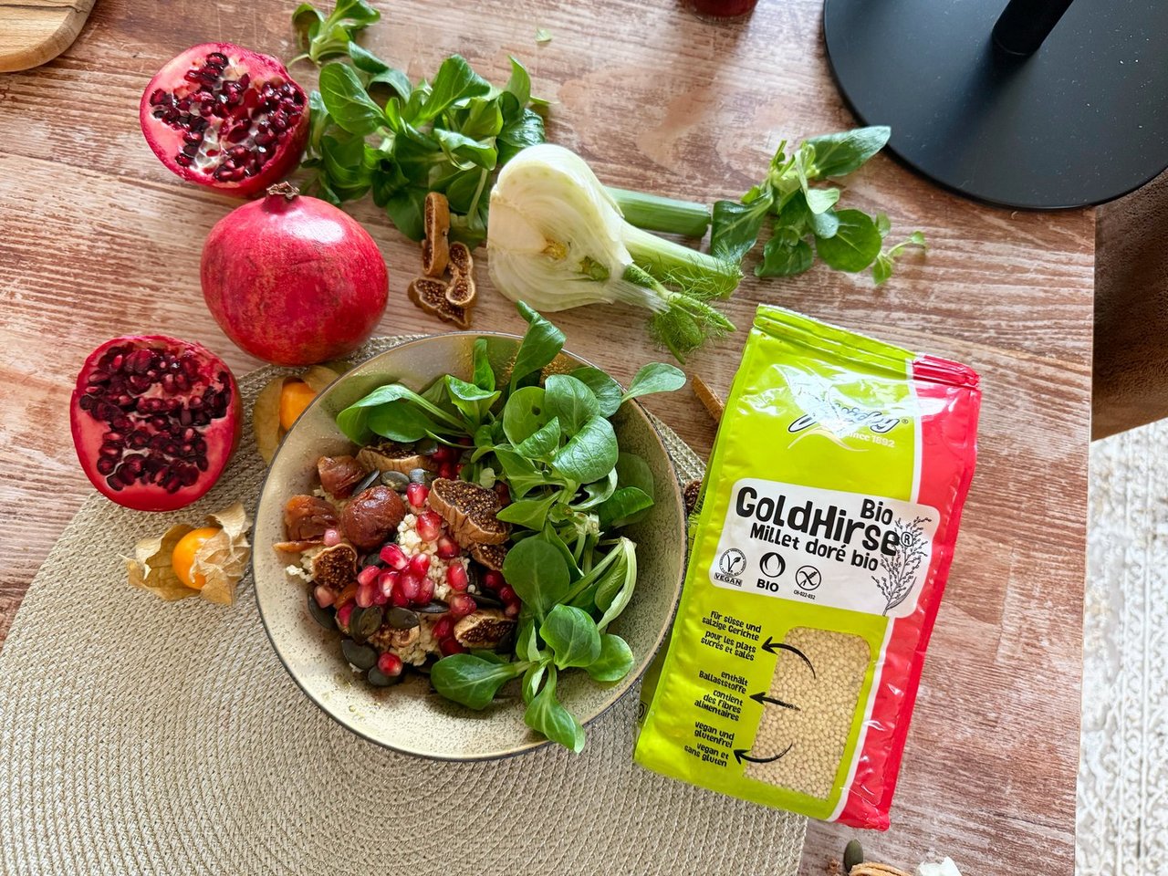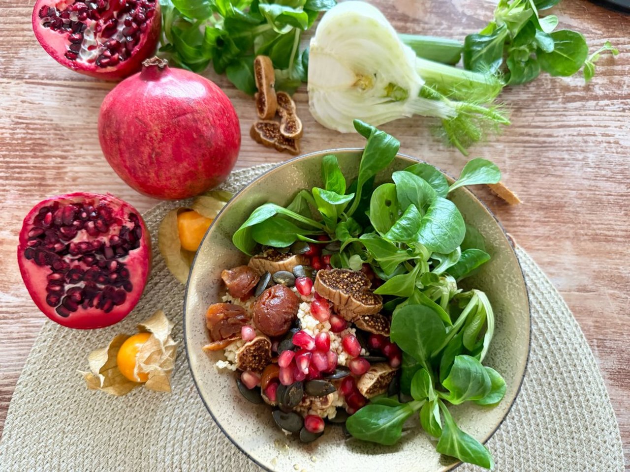 Winterlicher Goldhirse-Salat mit Feigen, Granatapfel und Nüsslisalat