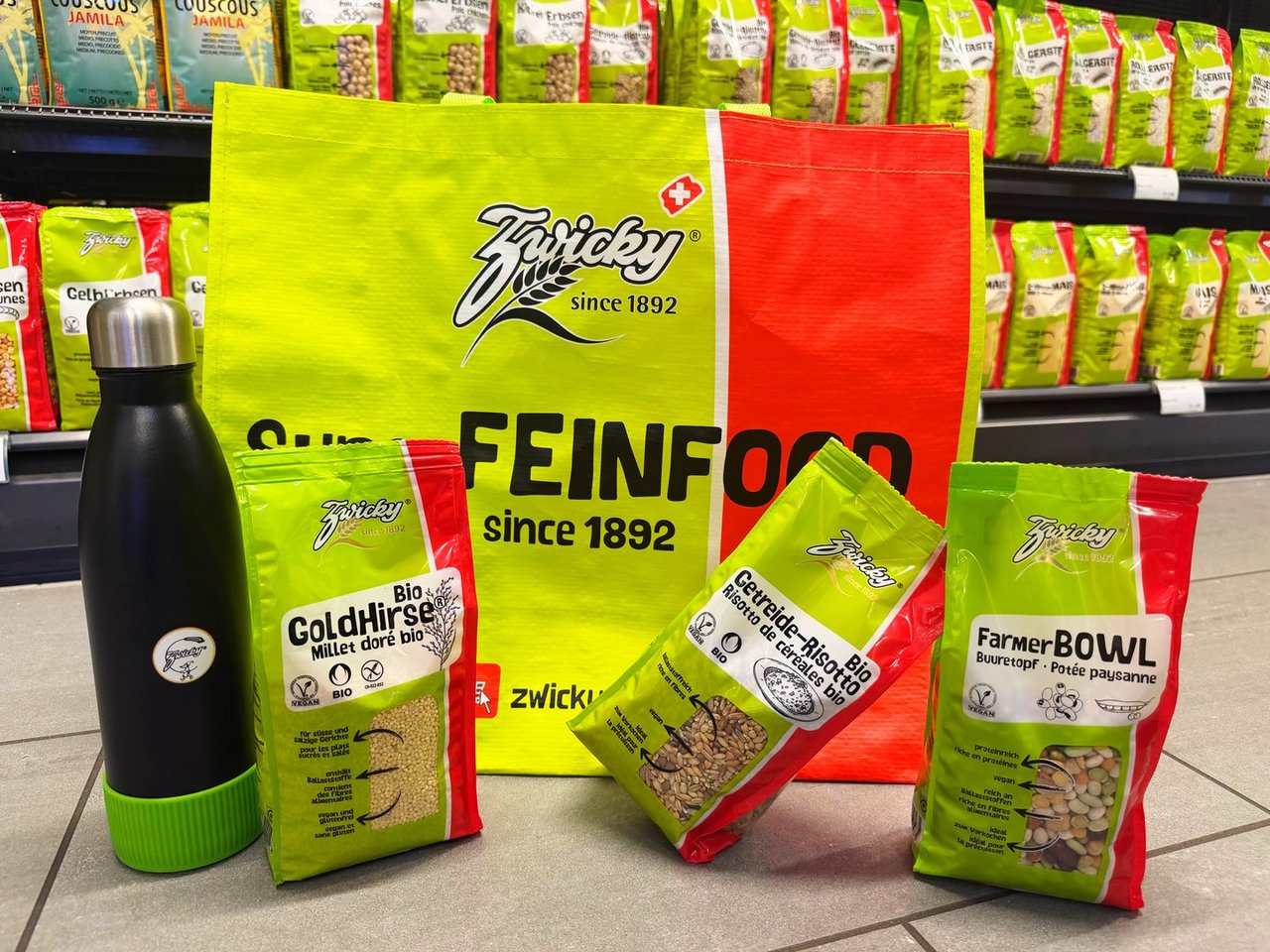 Eine Zwicky Tasche gefüllt mit Farmer Bowl, Getreide-Risotto und Goldhirse. Obendrauf gibt es eine Zwicky Thermosflasche.